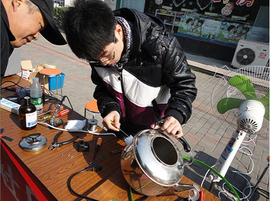 上午9时,师生们来到社区门口,拉起条幅、摆放好桌椅和工具之后,陆续有很多居民送来需要修理的家电,有电视机、电饭锅,微波炉,电吹风,收音机、电话机,电热水壶等。师生们认真组织安排:有专门负责接待、登记的,有专职维修的,有负责指导维修工作的,还有专门负责维持秩序的,分工明确并互相配合。有的电视机需要在线调试检测,老师还去了居民家里进行维修。有的老年人看到自己保存了十多年的收音机、电视机修好了,高兴的赞不绝口:“太好了,谢谢你们!”在师生们的努力下,共修理各类小家电56件,成功率高达90%以上,赢得了当地社区居民的一致好评。