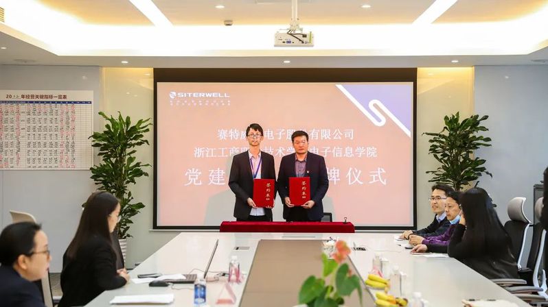 为贯彻落实党的二十大和省第十五次党代会精神,全面推进党建“四个融合”行动,探索校企地党建共同体模式,2022年11月9日下午,浙江工商职业技术学院电子信息学院党总支书记张鹏飞带队赴赛特威尔(SITERWELL)电子股份有限公司举行党建共同体签约、揭牌仪式。“双带头人”工作室负责人叶华杰、电子汽修党支部教师,赛特威尔电子股份有限公司相关领导、党建工作负责人等相关人员共同参与了本次活动。