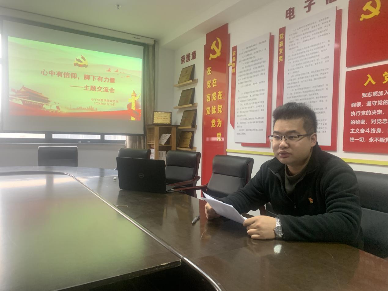 1月10日下午,电子信息学院党总支在中和楼315会议室举行了主题为“心中有信仰,脚下有力量”的2023年度生活困难党员补助金发放仪式。党总支书记张鹏飞,学院党总支组织员潘晶晶、学生第一支部组织委员魏文亮、受助学生以及优秀毕业生党员代表翁国栋参加了发放仪式。发放仪式由总支书记张鹏飞主持。