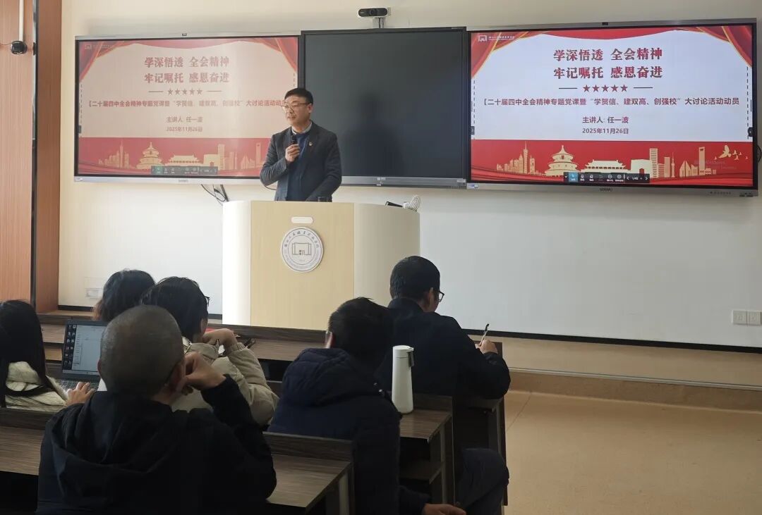 为深入学习贯彻党的二十届四中全会精神,扎实推进“学贺信、建双高、创强校”大讨论活动,11月26日,学校党委委员、组织部(统战部)部长任一波面向人工智能学院全体教职工、组织与服务党支部全体党员,讲授了题为“学深悟透全会精神 牢记嘱托感恩奋进” 的专题党课。党课深入解读全会核心要义,重温习近平总书记主政浙江时对学校的殷切嘱托,为学院下一步高质量发展明确目标方向、凝聚精神力量。