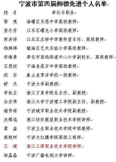 王璞老师获“宁波市第四届师德先进个人”