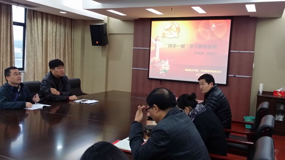 2016年11月23日,智能电子学院、汽车服务学院分工会在中和楼315召开两学一做专题学习会议,会议主题为“讲道德 有品行”。智能电子学院、汽车服务学院党总支书记张鹏飞做主题发言,从自己的角度解读如何在工作中做到“讲道德 有品行”,并对如何在工作中践行社会主义核心价值观谈了自己的想法。