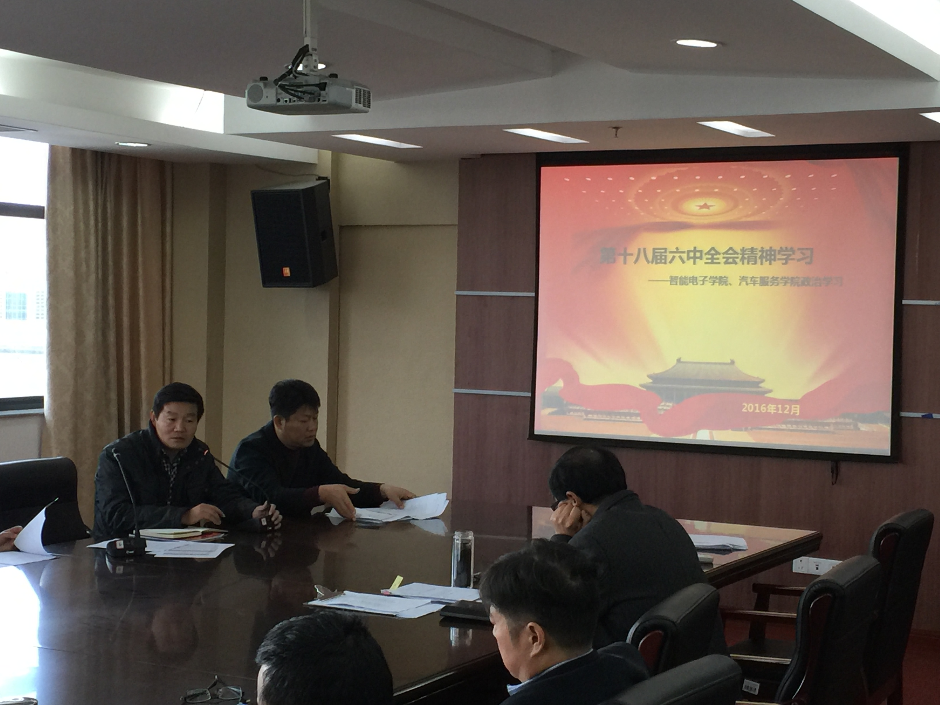 智能电子学院、汽车服务学院分工会在中和楼315组织全体成员学习十八届六中全会会议精神。会上,智能电子学院、汽车服务学院党总支书记张鹏飞做专题讲话,并从具体工作的角度结合实际谈了自己对如何践行十八届六中全会会议精神的想法。